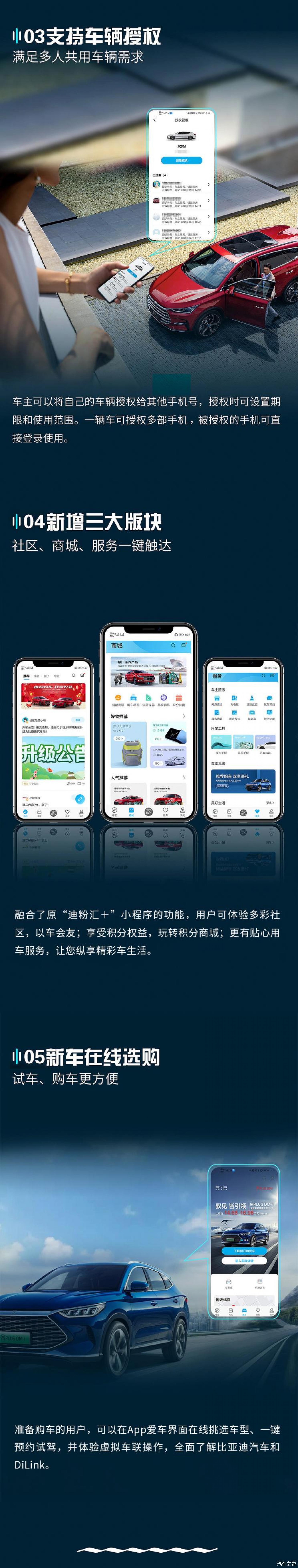 此外,车主还可以通过自己的车辆授权给其他手机号,授权时可设置期限和适用范围,一辆车可授权多部手机,被授权的手机可以直接登录使用。值得一提的是,新版App还融合了原“迪粉汇+”小程序功能,用户可体验社区功能,并享受积分权益等。