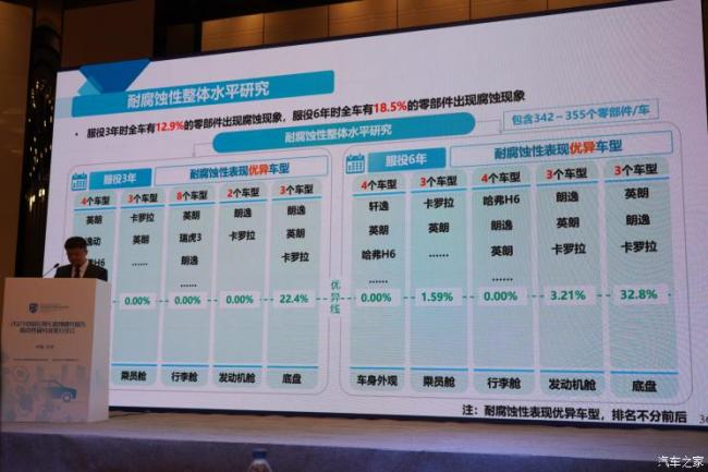 耐腐蚀性整体水平研究方面,在服役3年时,英朗、逸动、哈弗H6等4个车型在车身外观区域没有零部件发生腐蚀,表现相对优异;卡罗拉、英朗等3个车型在乘员舱区域没有零部件发生腐蚀,表现相对优异;英朗、瑞虎3、朗逸等8个车型在行李舱区域没有零部件发生腐蚀,表现相对优异;朗逸、卡罗拉2个车型在发动机舱区域没有零部件发生腐蚀,表现相对优异;朗逸、英朗、卡罗拉3个车型的底盘区域零部件腐蚀率最低,表现相对优异。在服役6年时,轩逸、英朗、哈弗H6等4个车型在车身外观区域没有零部件发生腐蚀,表现相对优异;卡罗拉、英朗等3个车型的乘员舱区域零部件腐蚀率最低,表现相对优异;哈弗H6、朗逸、英朗等4个车型在行李舱区域没有零部件发生腐蚀,表现相对优异;朗逸、英朗、卡罗拉3个车型的发动机舱区域零部件腐蚀率最低,表现相对优异;英朗、朗逸、卡罗拉3个车型的底盘区域零部件腐蚀率最低,表现相对优异。