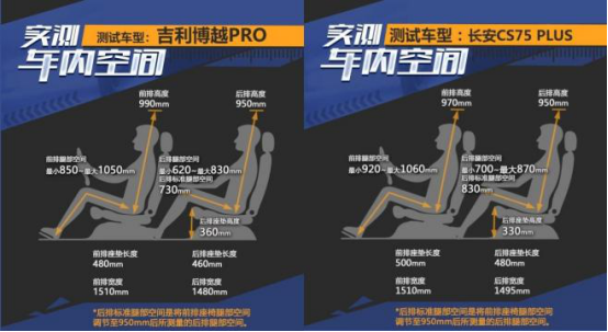 吉利博越PRO车身尺寸为4544*1831*1713mm,长安CS75 PLUS车身尺寸为4690*1865*1710。实际乘坐体验如图所示,在前排空间与后排坐垫高度上,吉利博越PRO表现更为良好,而长安CS75 PLUS在腿部空间上更有优势,二者算个“平手”。座椅的舒适度上,吉利博越PRO偏向于柔软、有包裹性,而长安CS75 PLUS则更为运动,感觉偏硬。