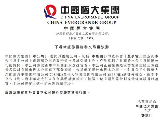 [本站 资讯] 10日晚间,中国恒大、恒大汽车、恒大物业联合公告称,公司正在接触几家潜在独立第三方投资者探讨有关出售本公司旗下部分资产,包括但不限于出售公司上市附属公司中国恒大新能源汽车集团有限公司及恒大物业集团有限公司的部分权益。